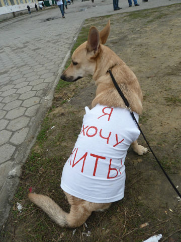 Зеленое движение «ЭКА» , КГОО «Центр помощи животным» и просто неравнодушные люди в рамках акции «Россия без жестокости», вышли на центральный Арбат для того, чтобы в этот день выразить свое несогласие с намерением ввести на законодательном уровне уничтожение (в том числе, так называемую эвтаназию) бездомных и оставшихся без попечения хозяев домашних животных в качестве способа регулирования их численности, а также за скорейшее принятие закона об «Об ответственном обращении с животными», предусматривающего полноценную административную и уголовную ответственность за жестокое обращение с животными. В пикете также участвовала замечательная собака Ева в майке с надписью « Я хочу жить!»